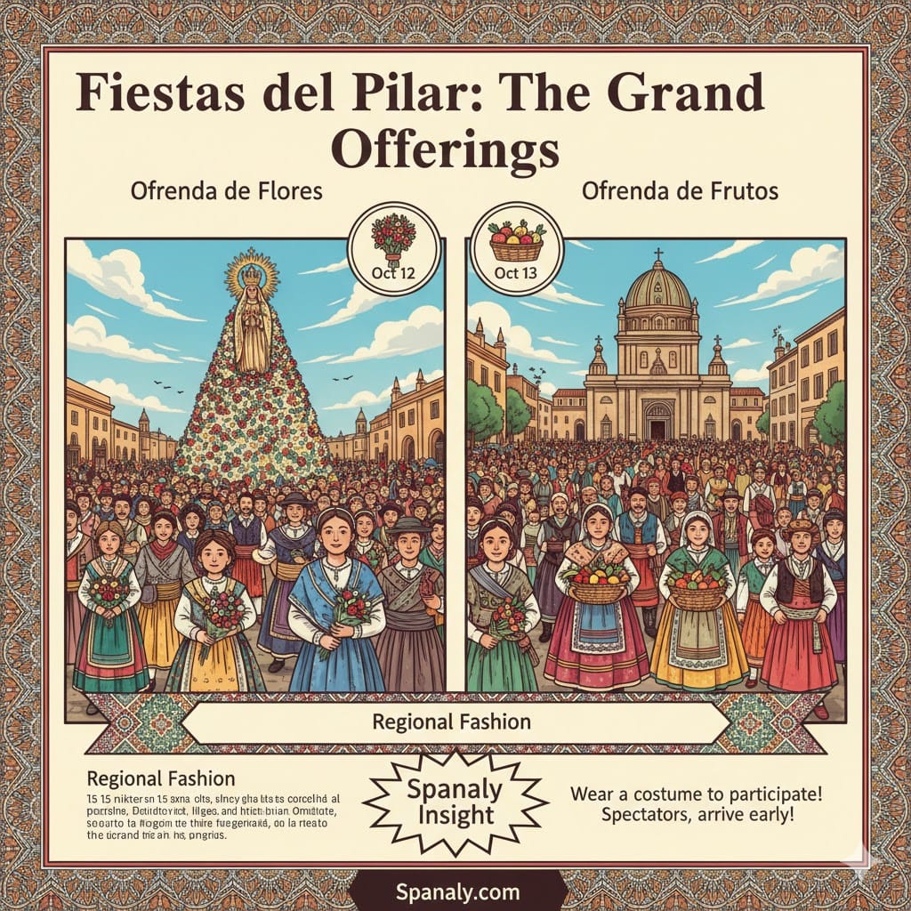 🌟 Spanaly Insight: Watching the Flower Offering is free, but if you want to participate and walk the route, you must wear a traditional costume (from any region or country). If you are a spectator, find a spot early at the Plaza del Pilar to see the floral pyramid reach its full glory by sunset.
