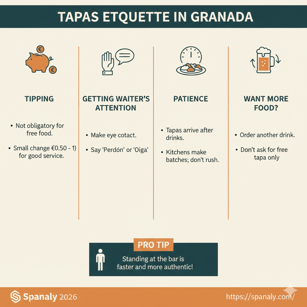Understanding the local etiquette ensures you receive the best service and blend in with the Granada crowd. While the tapas are free, following these simple social rules will make your experience much smoother in 2026. If you are ever unsure of the local customs, our guide to Cultural Etiquette in Spain covers everything from greetings to social norms.