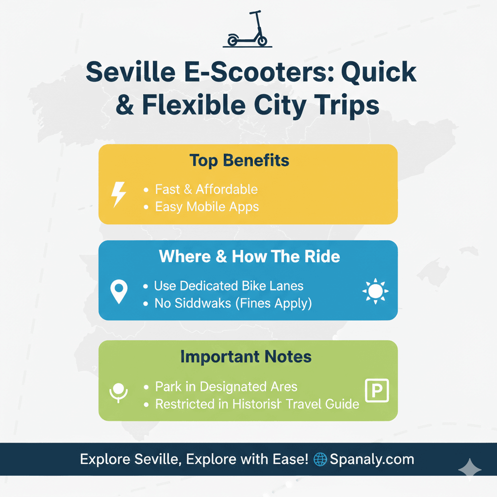 E-scooters have become a popular choice for quick, short-distance trips within Seville’s central neighborhoods. They offer a modern and flexible alternative to traditional transport, especially for younger travelers or those in a hurry. However, it is important to follow local regulations to ensure a smooth experience.