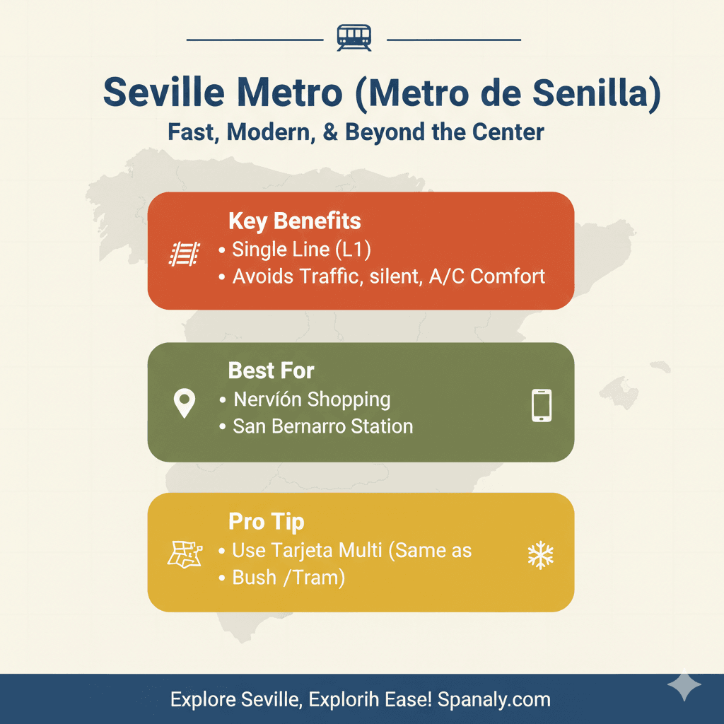 Although Seville currently has only one metro line (Line 1), it remains a highly efficient way to cross the city. It is especially useful if you stay in the Nervión area or near the San Bernardo station. Furthermore, the metro is modern, fully air-conditioned, and helps you avoid heavy traffic during peak hours.