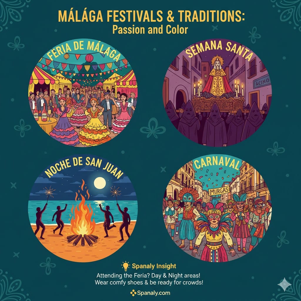 🎭 Carnaval: A colorful explosion of creativity in February, featuring satirical singing groups (murgas) and elaborate parades through Calle Larios.