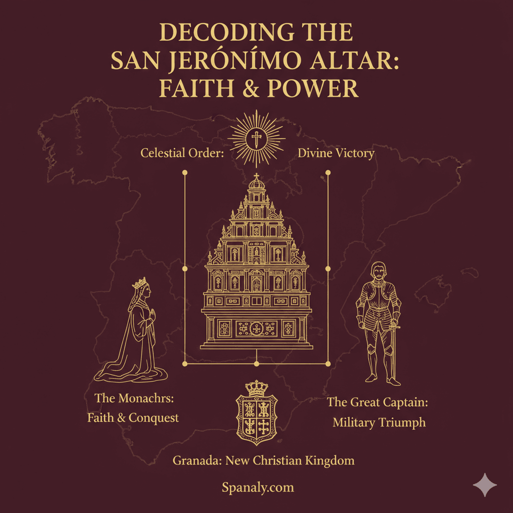 • ⚔️ Union of Faith and Power: The altar features images of the Catholic Monarchs and the Great Captain alongside saints, symbolizing that their earthly victories were divinely inspired.