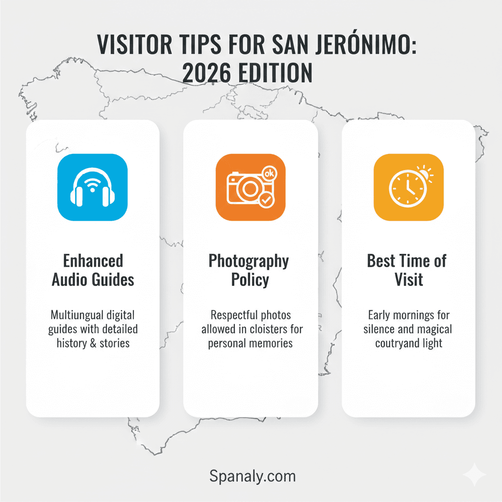 A practical travel infographic providing essential visit information for the Monastery of San Jerónimo in Granada, including location, ticket tips, and dress code by Spanaly.com