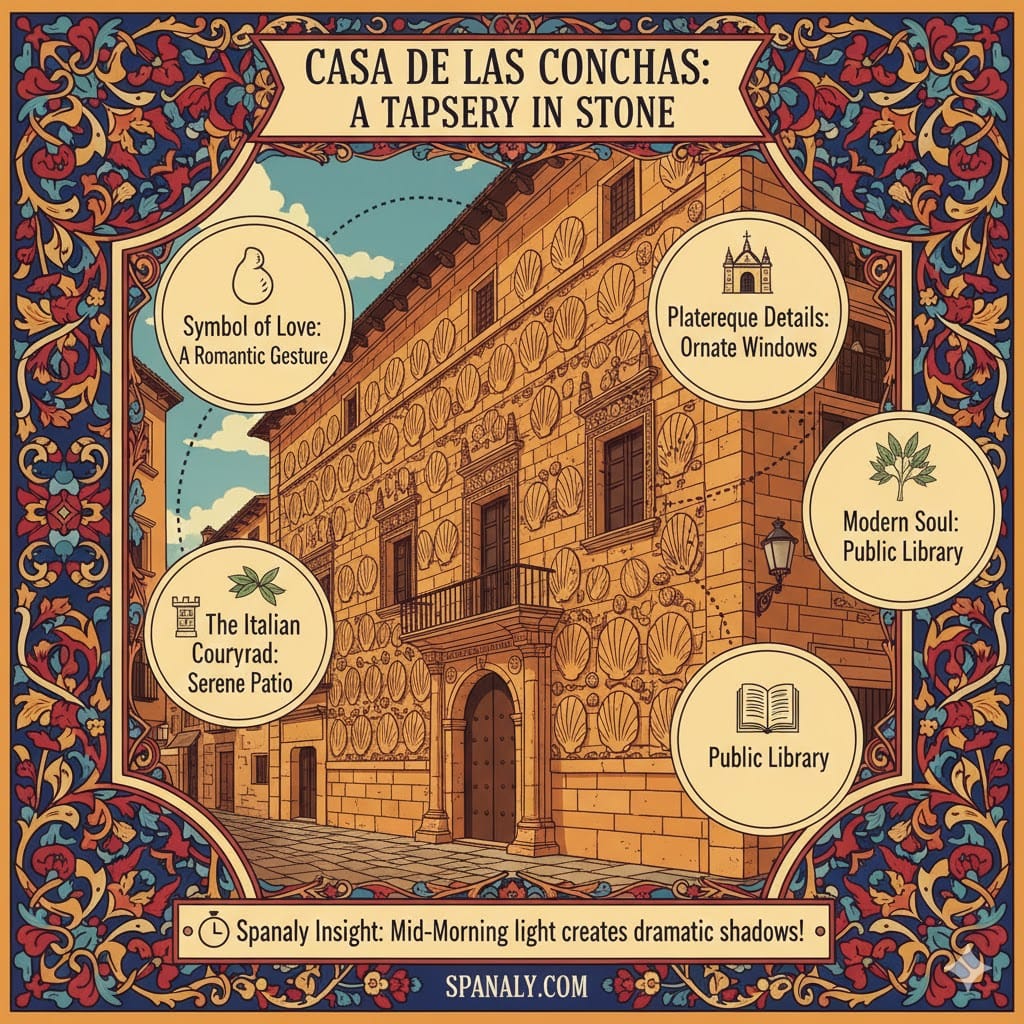 • 🪟 Plateresque Details: You should admire the delicate ironwork on the windows. In fact, experts consider this ironwork some of the finest in Spain.