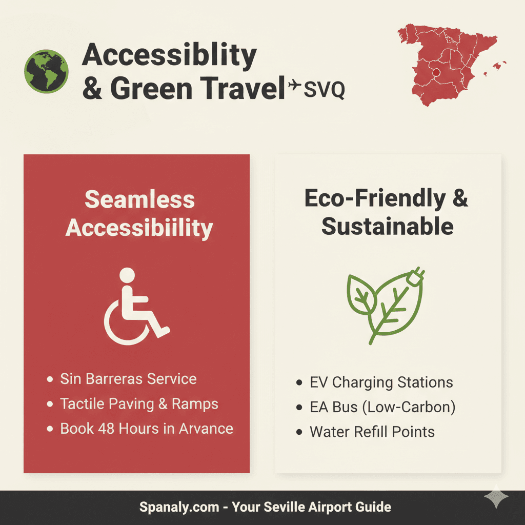 Seville Airport is committed to being an inclusive and environmentally conscious hub. In 2026, SVQ has introduced several initiatives to align with modern travel standards: