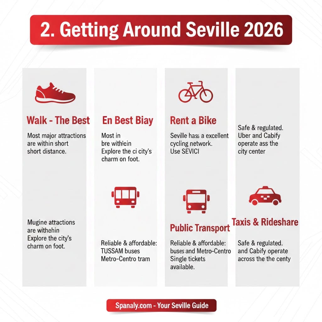 • 🚶 Walk – The Absolute Best Way: Most iconic landmarks (Cathedral, Alcázar, Santa Cruz) are clustered together. Walking is the only way to discover the hidden plazas and narrow alleys that buses can’t reach.